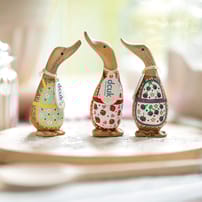 Dinky Ducks travel in their own illustrated gift boxes with ribbon handles, making them very collectable and perfect for giving as gifts. We give all our wooden duck characters a friendly name tag, but you might like to pick one yourself.